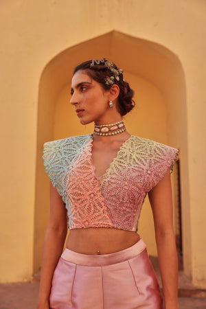 This stylish outfit features a front slit flared pants in satin fabric. The off-shoulder structured top is made from a vibrant, multi-colored knitted fabric. This modern ensemble offers a blend of interesting textures and a sophisticated silhouette.