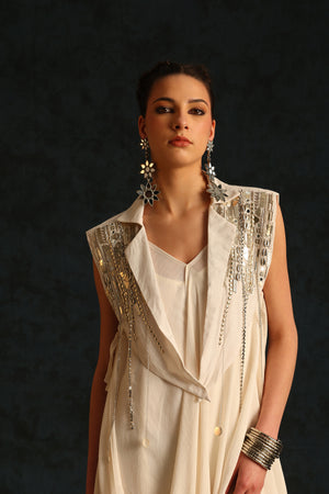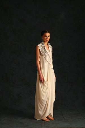 Cowl dress with a cape blazer waistcoat embellished with silver metallic embroidery.