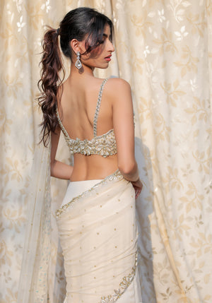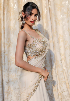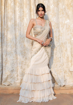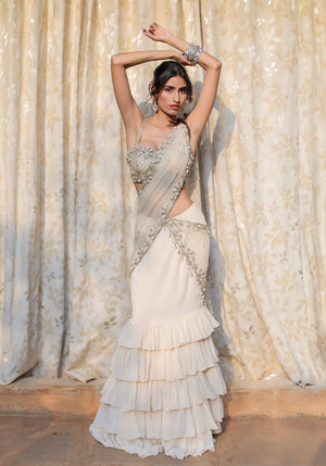 The Cream Ruffle Skirt Is Made From High-Quality Georgette With Multiple Ruffle That Flare Out To Create Mermaid Flowy Look.The Blouse Is Designed With Intricate Hand Embroidery Using Mirrors, Cowrie, And Threads with an embriodered Dupatta Made From Net Fabric.