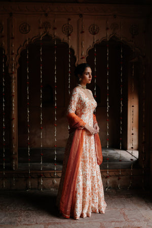 Featuring a cream and orange printed silk anarkali with dori, sequin and zardosi embroidery on sleeves paired with pure organza dupatta.