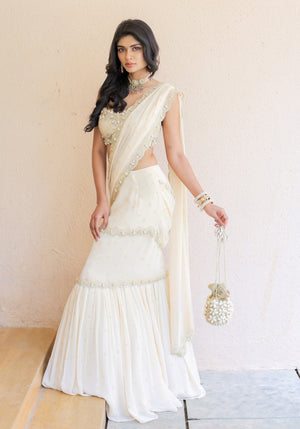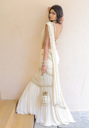The Cream Mumtaz Drape Saree With Hand Embroidered Mirror and Cowrie Work Blouse Is Made Of High-Quality Georgette Fabric. The Saree Features Intricate Embroidery Work All Over, In Golden Thread, Mirror and Cowrie work and cutdana which Includes Delicate Floral Designs.