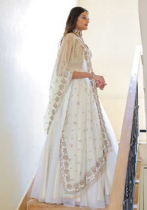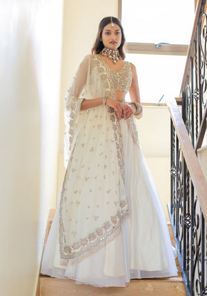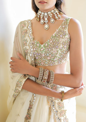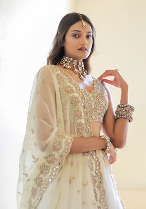 Candle Cream Organza Lehenga is paired with a Blouse which Is Made On A Net Fabric and An Organza Dupatta Featuring Intricate Hand Embroidery In Shimmering Mirror Work, Adding A Touch Of Sparkle And Glamour To The Ensemble.