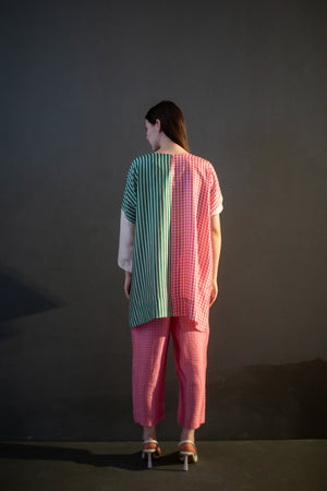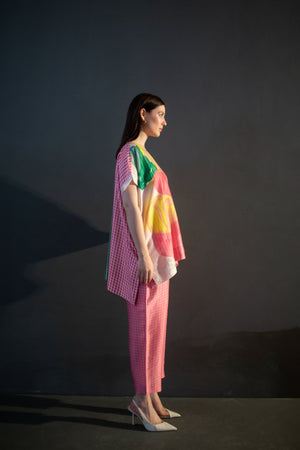 A two piece dupion silk set comprised of abstract geometric and floral print in playful color compositions and parallel pants with fusion textiles.