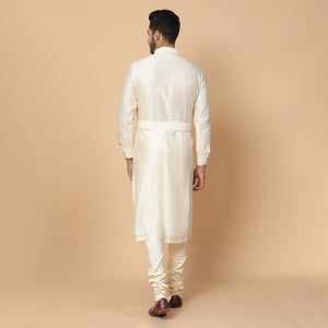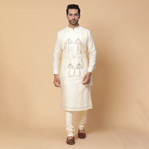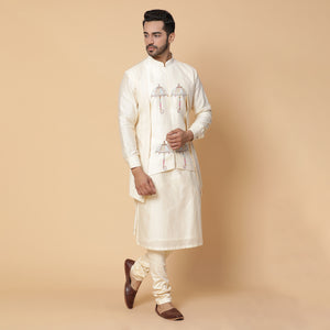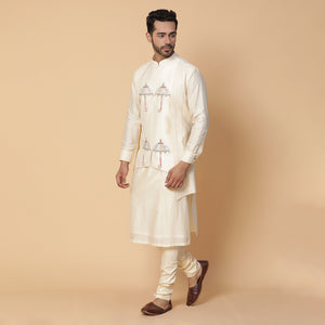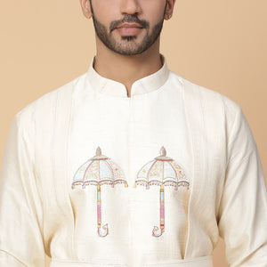 cream panneled modern cuff kurta with embroidery of Umbrella on front paired with same color true comfort chooridar