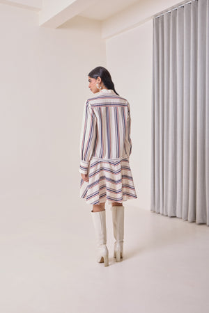 A playful shirt dress with a refined twist. Designed in a crème striped base with floral placement prints on the front, accented with lace detailing at the collar and seams. Finished with a ruffled hem that brings a fun, youthful energy to the silhouette. Easy to wear, flattering across ages, and perfect for everyday or getaway dressing.
