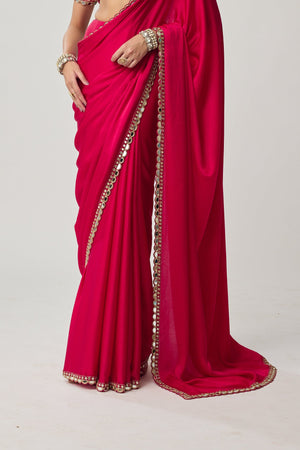 Crimson Red Gota Mirror hand embroidered Satin Saree clubbed with real hand cut mirror embroidered Elbow sleeve blouse.