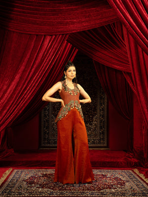 Stand out with this charming crimson red peplum kurta set, featuring a quilted jacket adorned with intricate zari work, multicolor beads, and vintage zardosi embroidery. Paired with flared pants, it’s enhanced with cute tassel detailing along the embroidered edges for a festive, elegant look.