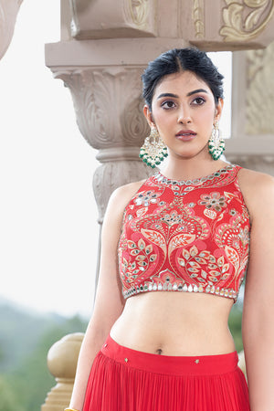 Bold, unapologetic, and luminous—this sindoor red printed crepe halter neck blouse is a celebration in every stitch. Hand-embroidered with all-over mirror work, it reflects both light and spirit, designed for those who revel in making a statement. The halter neckline adds a contemporary flair, balancing tradition with fearless femininity. It’s paired with a solid red georgette skirt that flows like rhythm itself, adorned with scattered sequin embroidery that twinkles softly with every move. The contrast between the printed blouse and the minimal yet glimmering skirt creates a visual harmony that’s vibrant yet refined. Not just a set. A mood. A movement. A mirror to your most colorful self.