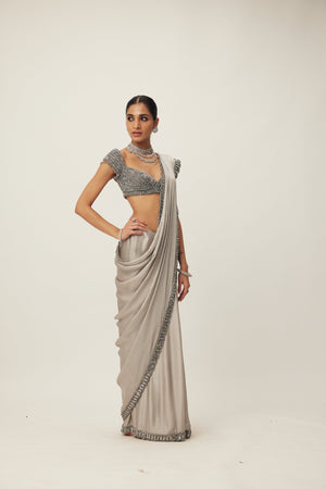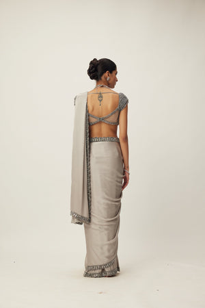 Intricately Hand Embroidered Satin Saree featuring sequins and crystal embroidery clubbed With cap sleeved jewelled blouse with crystal embellishments.