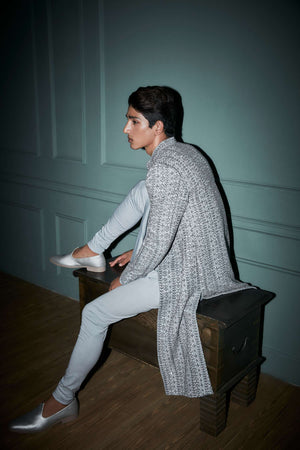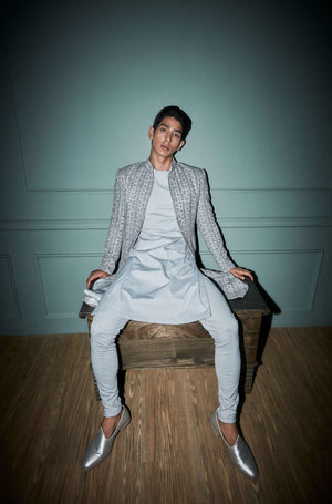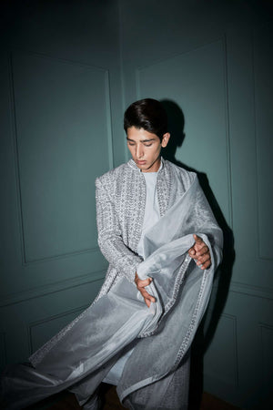 A stunning crystal grey sherwani set fabricated in Lucjnowi Linen Satin, crafted in cut dana, salli and bead work embroidery. The sherwani has full sleeves and a mandarin collar and comes with a kurta, pants, dupatta and shoes.