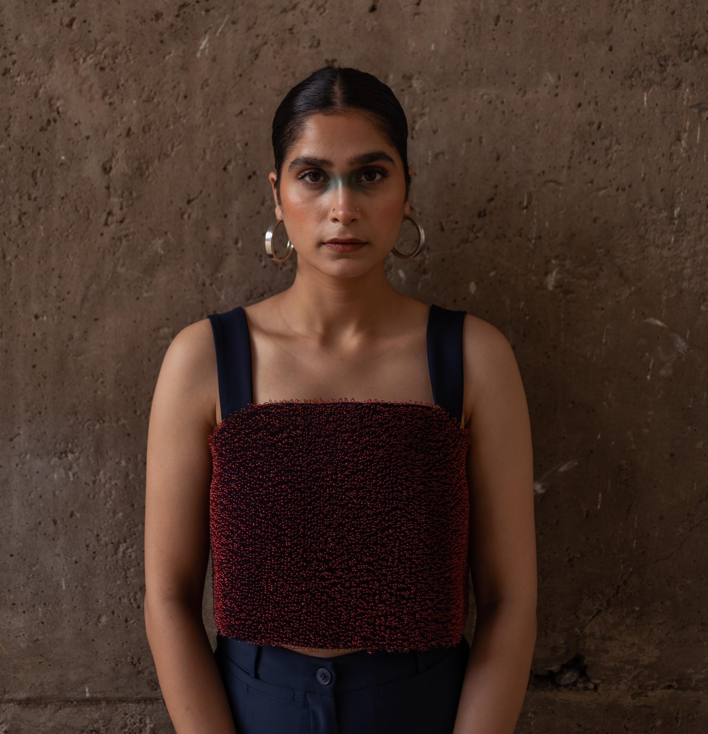 Short jacket with hand- textured recycled PVC cord sleeve detail, sleeve length covering elbow, relaxed fit,