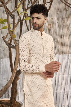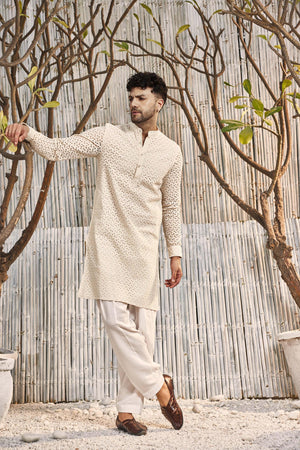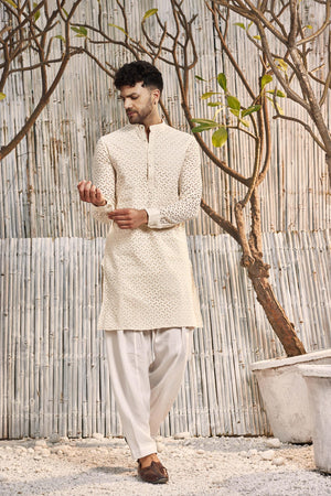 Schiffli comfort fit straight plain kurta, paired with salwar. The kurta features mandarin collar & side pockets.