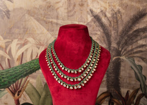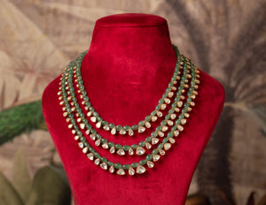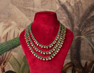 The Daaniyal necklace is a luxurious piece designed for men, combining timeless elegance with a bold, masculine edge. This necklace features three distinct layers, each crafted from premium 92.5 sterling silver, providing strength and durability. The intricate craftsmanship shines through the moissanite polki that is spaced discreetly without twisting over upon wearing. The silver is plated with 18k gold, adding a touch of opulence and warmth to the design.