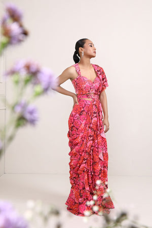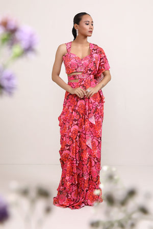 The saree features a delicate floral print in various shades of pink, creating a captivating and romantic design. These blossoms are intricately detailed, adding depth and texture to the fabric. The loose end of the saree, is adorned with layers of ruffles that cascade gracefully. It's designed with embroidered highlights