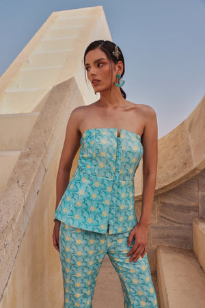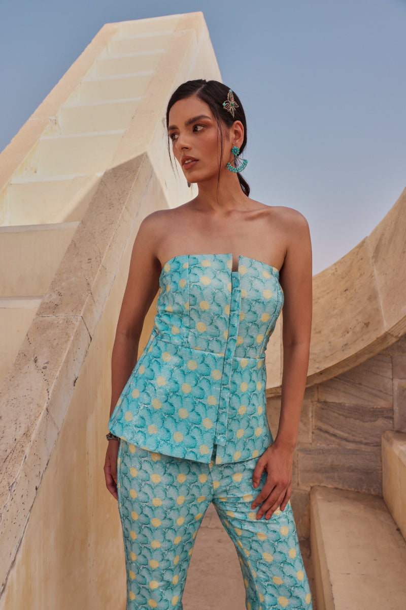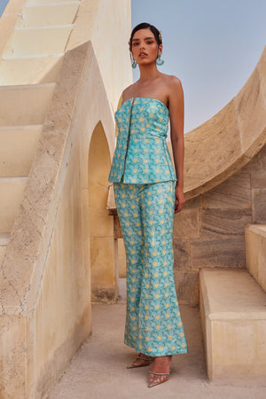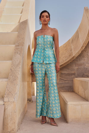 This stylish blue georgette cord set features a sequin-embellished fabric, adding a such subtle sparkle. It features a peplum top and wide-legged trousers. The ensemble presents a modern and chic look.