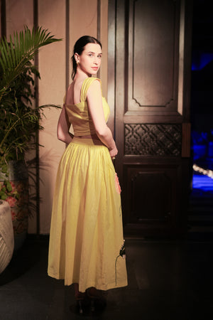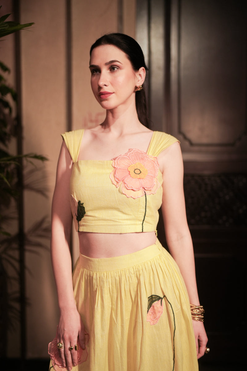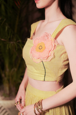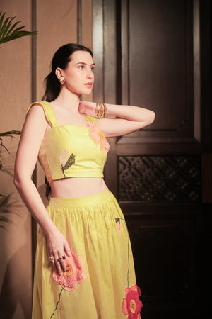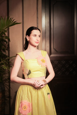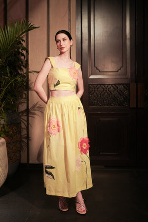 Yellow linen top and skirt with embroidered flowers sounds so refreshing and cheerful! The bright yellow color is perfect for adding a pop of sunshine to your outfit, and the floral embroidery gives it a lovely, playful touch. It's great for casual outings or even a fun day at the beach.