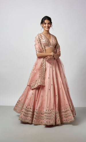 This enchanting lehenga set features an intricate mirror and sequin embellishment. The blouse showcases a deep V-neck with delicate embroidery, paired with a flowing lehenga skirt adorned with an elegant border. The organza dupatta with shimmering details, completes the look.