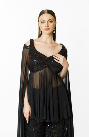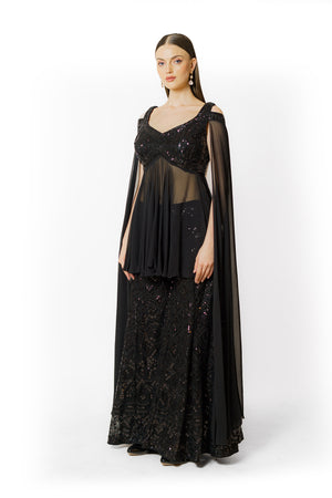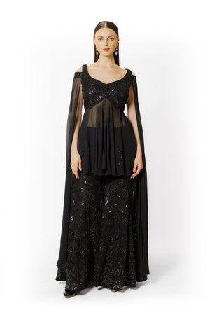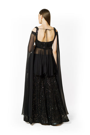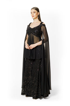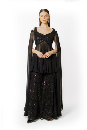 Black Tonal Sequin And Thread Sahrara W Peplum Set Gorgette/ Net