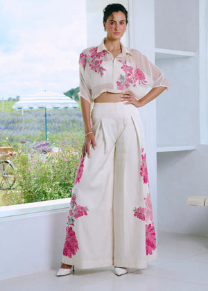 Box Pleated Pant With Cropped Dolman Sleeves Shirt In Appliqué Embroider & Silk Bustier