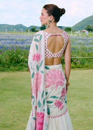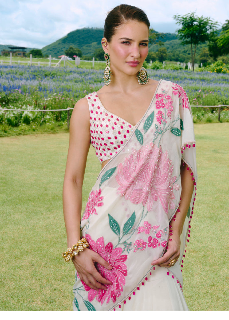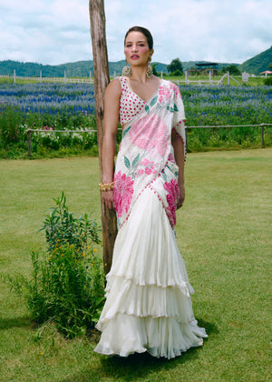 3 Tiered Appliqué Embroidered Drape Saree With Embellished Blouse