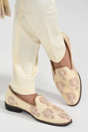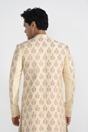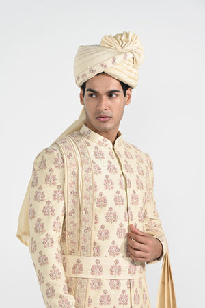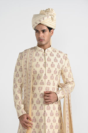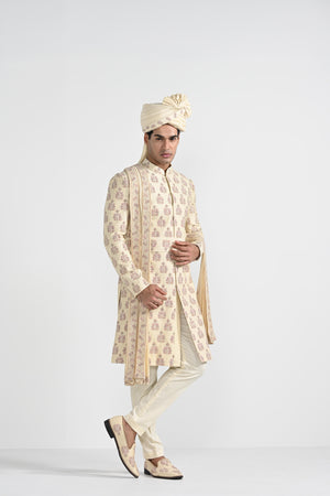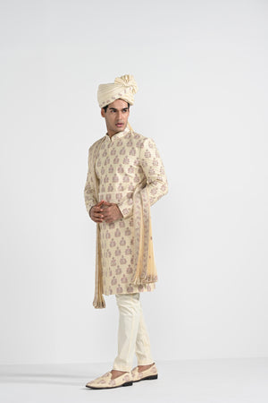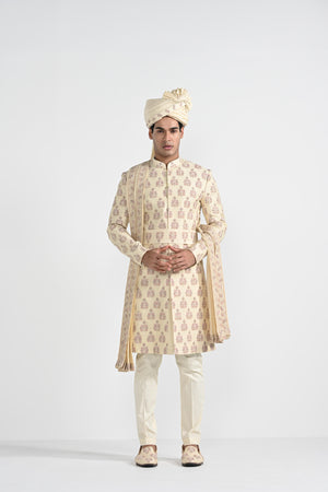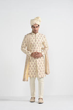 Dark Cream Butta work embroidery along with thread work detailing on the Sherwani crafted on bamberg raw silk.Paired with Dark Cream kurta ,churidar,belt,duptta ,sevra,tani,safa and jooti . Color of the actual garment may vary due to lighting conditions during the shoot .