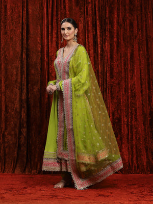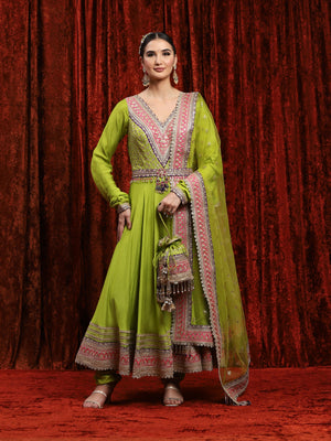 Elevate your charm with our dark lemon green silk chanderi anarkali suit, highlited with rani pink and purple detailing and adorned with intricate gota, dori, badla and kasb work. Paired with a graceful net dupatta and churidar, this ensemble exudes opulence. Accentuating the waistline is a chic belt adorned with delicate tassel detailing, adding a touch of refinement to the ensemble.