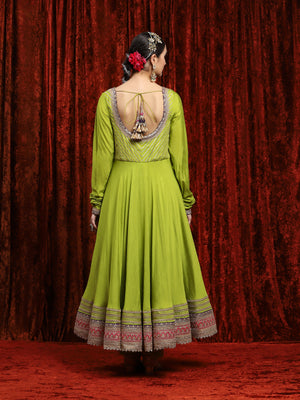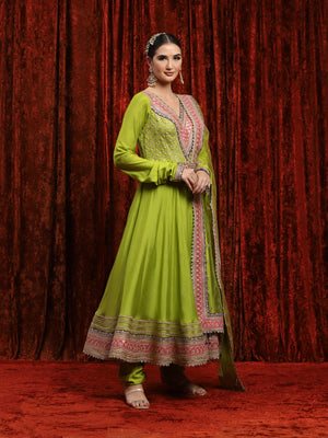 Dark Lemon Green Rani Pink & Purple Silk Chanderi Anarkali Suit