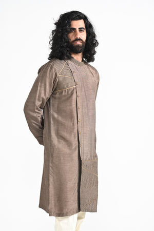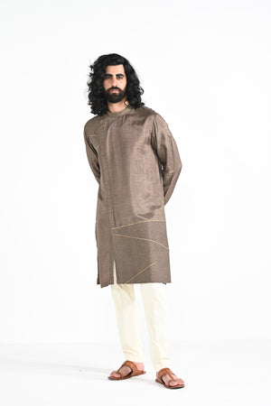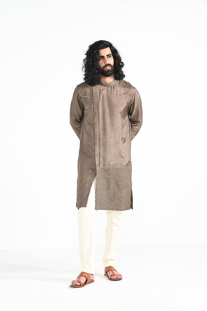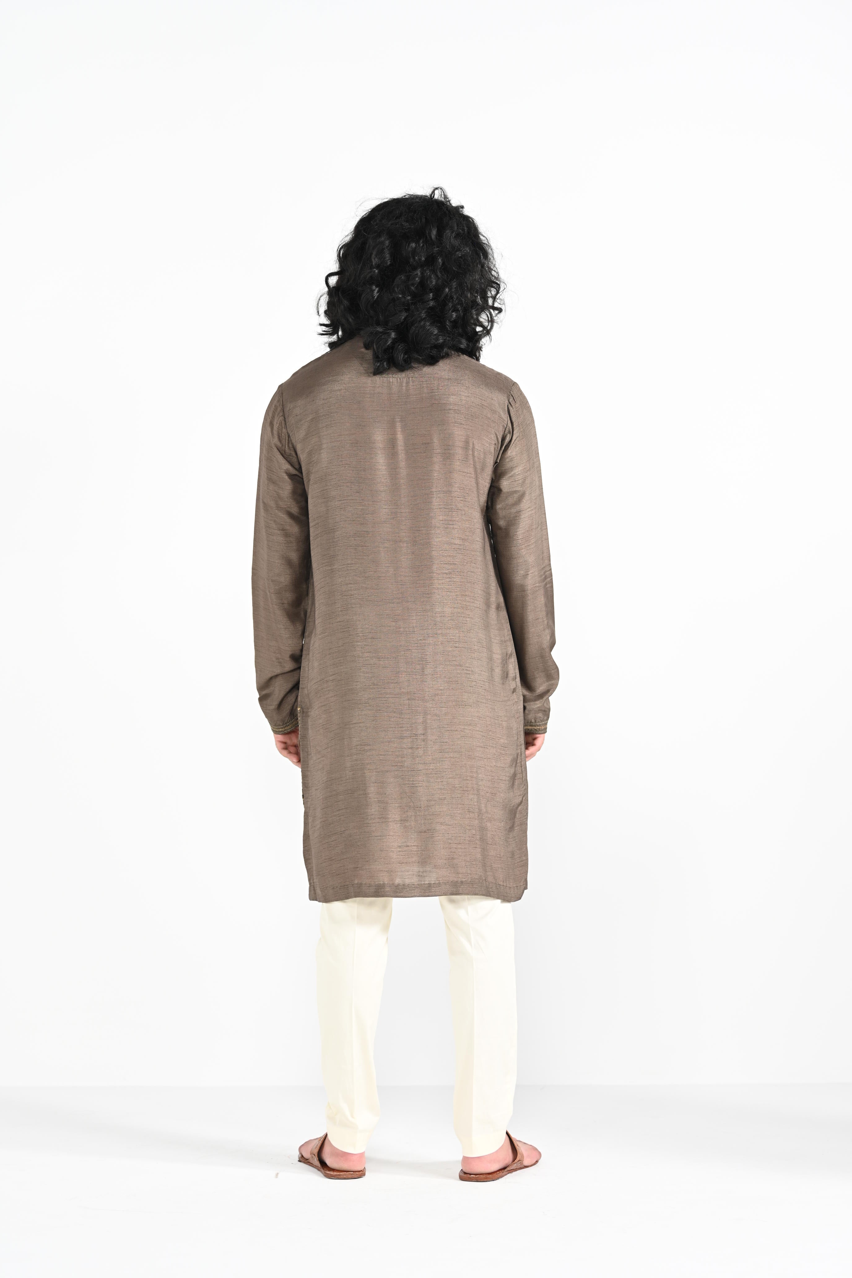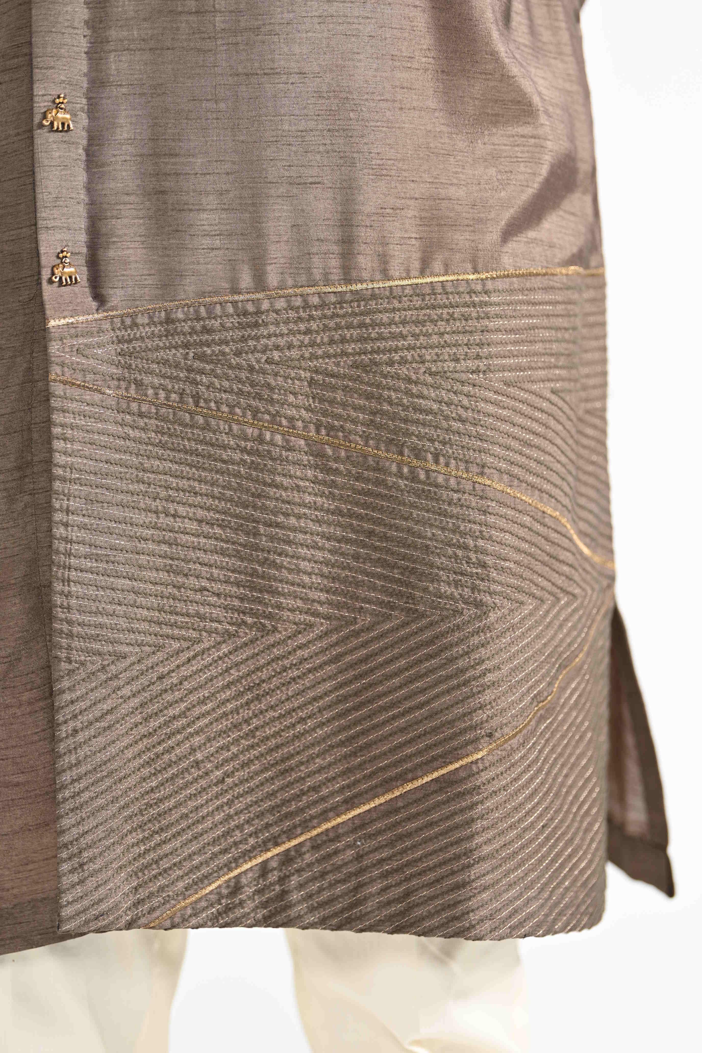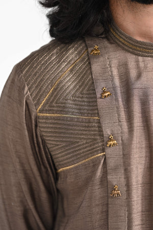 Dark oak elephant metal and tissue stitchline detailing work embroidered on bamberg raw silk.Paired with Buttercream slim fit Pant Pajama. Color of the actual garment may vary due to lighting conditions during the shoot .