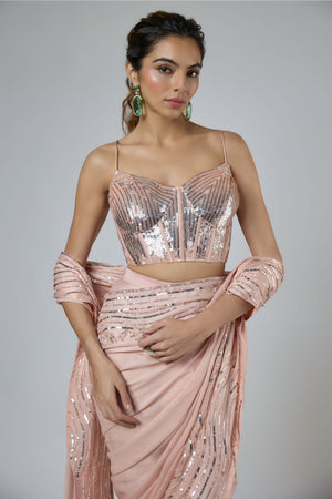 Bold yet refined, this dark peach saree crafted in Bemberg satin georgette exudes festive allure. Paired with a heavily embroidered Tussar silk corset blouse, it redefines contemporary couture with a hint of drama.