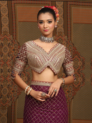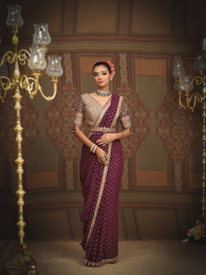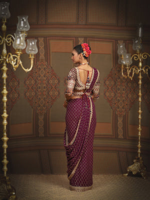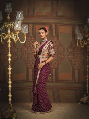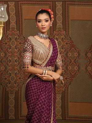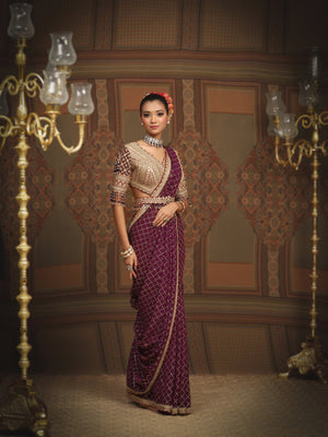Elegantly drape yourself in our Georgette Dark Purple and Maroon saree, embellished with delicate Gota, Dori and Badla work. The accompanying silk chanderi blouse boasts a graceful V neckline, adding a touch of allure. The fusion of deep purple and rich maroon embodies the seamless blend of tradition and modernity that sarees represents.
