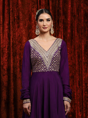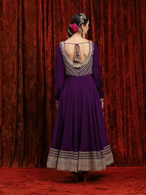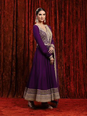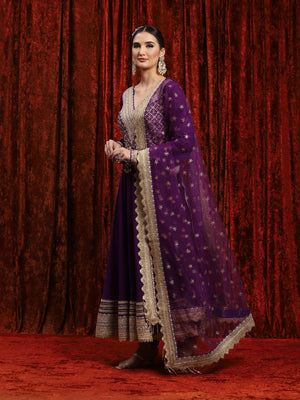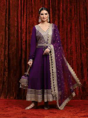 Experience the allure of our dark purple anarkali suit, enriched with intricate gota, dori and badla work. Paired with an embroidered net dupatta boasting intricate tassel details, alongside a sleek churidar for added flair. To elevate the silhouete, a belt, also feturing delicate tassel detailing cinches the waist, adding a graceful flourish to one's look.