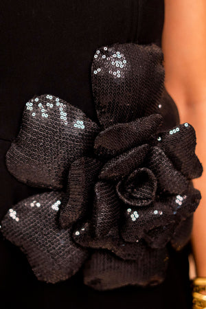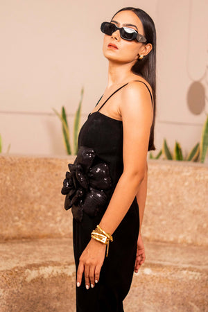 The jumpsuit is designed to be both comfortable and stylish, with a flattering fit and sleek silhouette. It has a sequin flower on the side is perfect for a special occasion or a night out. Pair it with some stylish heels and accessorize with minimal jewelry to let the jumpsuit take center stage