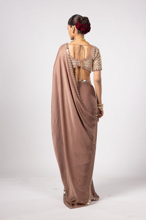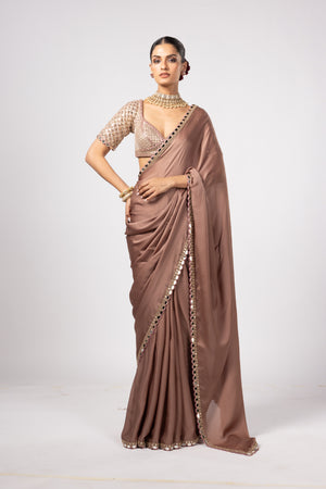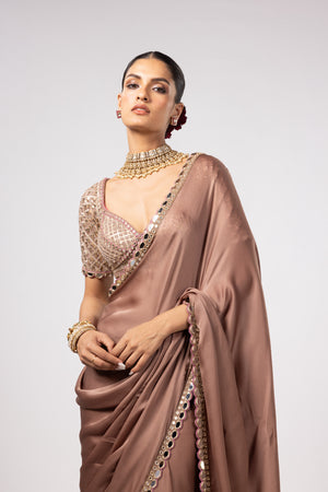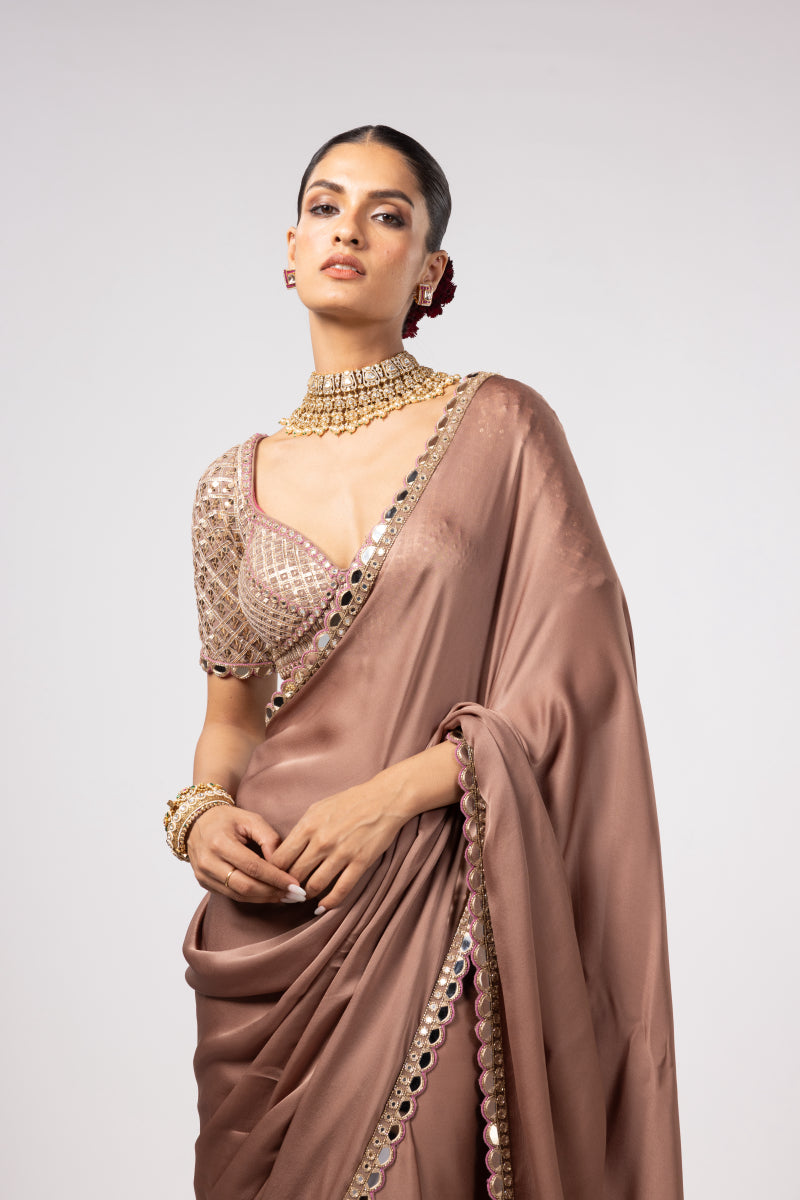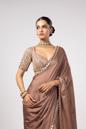 DEEP BEIGE SATIN SAREE WITH SWEETHEART NECK BLOUSE