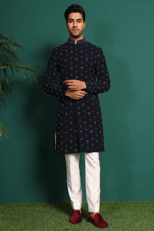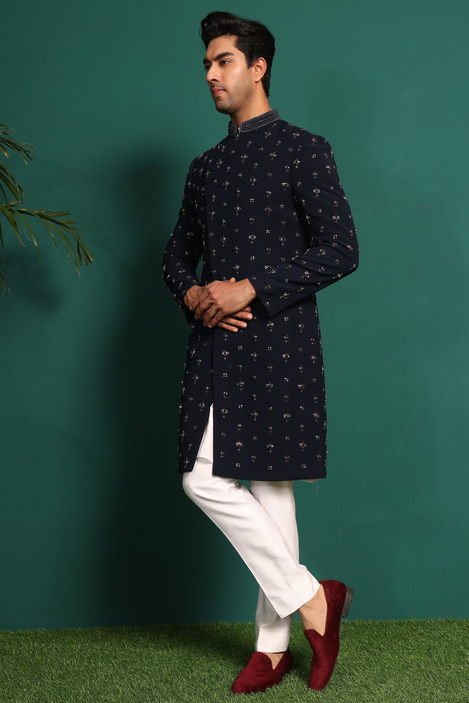Infusing a touch of Western flair into tradition, our Deep Blue Indowestern handembroidered with stone & Cutdaana details steals the spotlight with its exquisite placement embroidery. This Indo-fusion ensemble is perfect for elevating your style at any wedding celebration. Best paired with white trousers for a harmonious blend of sophistication. 💫🤵