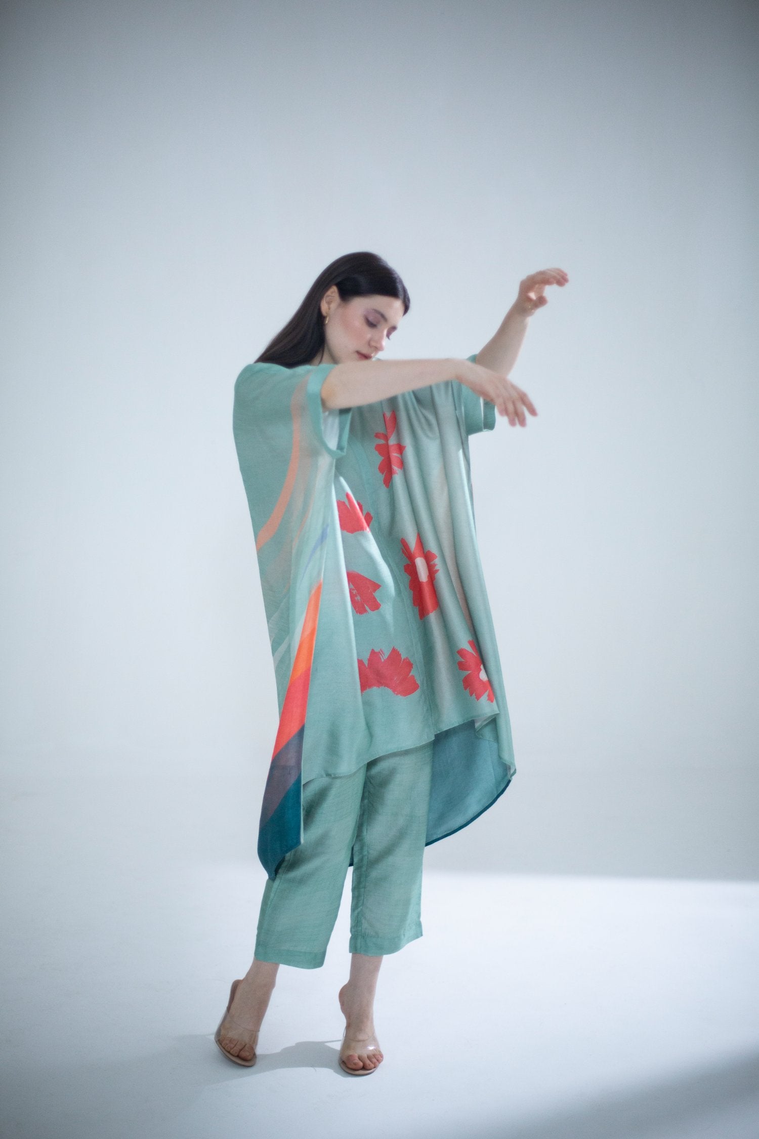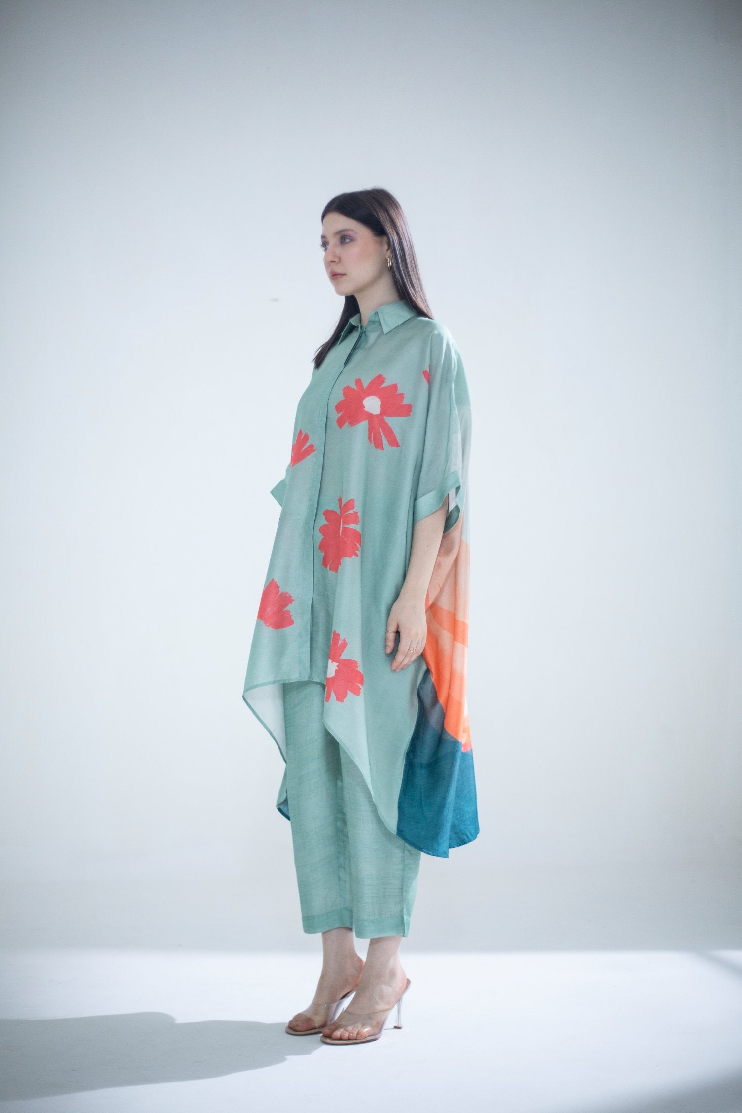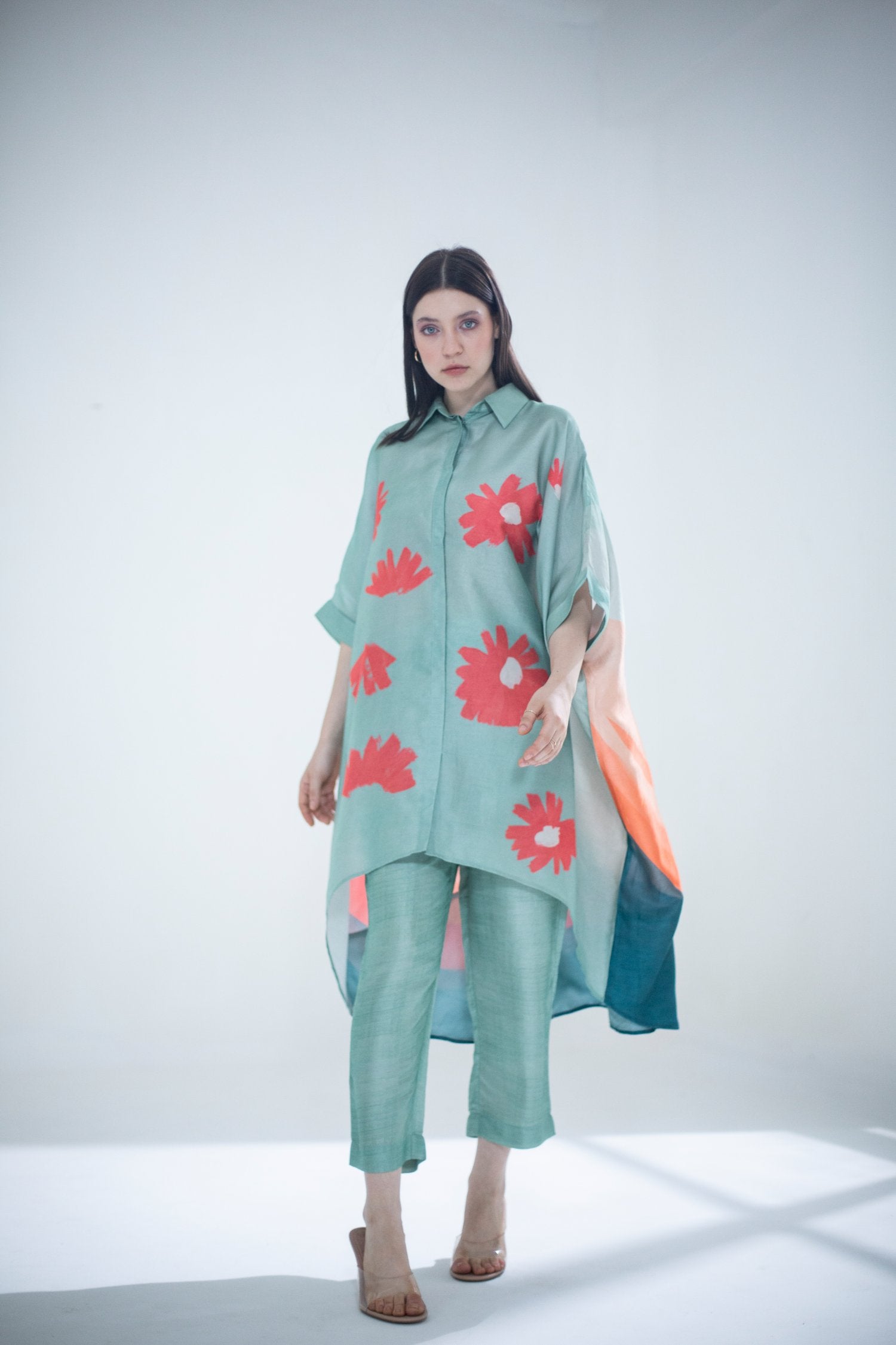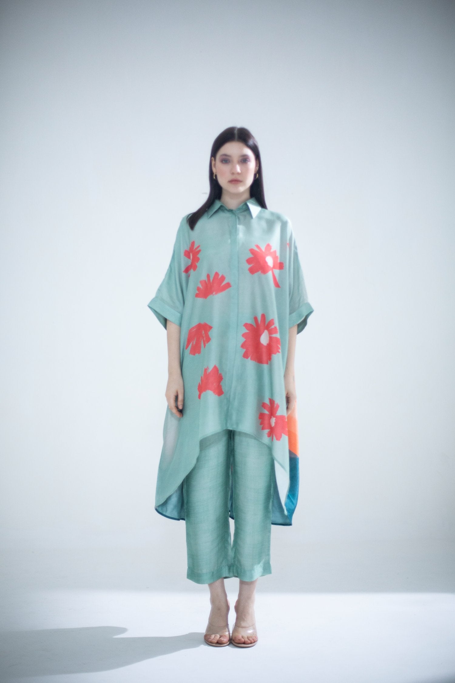 A two piece dupion silk set comprised of abstract geometric and floral print in playful color compositions and parallel pants with fusion textiles.