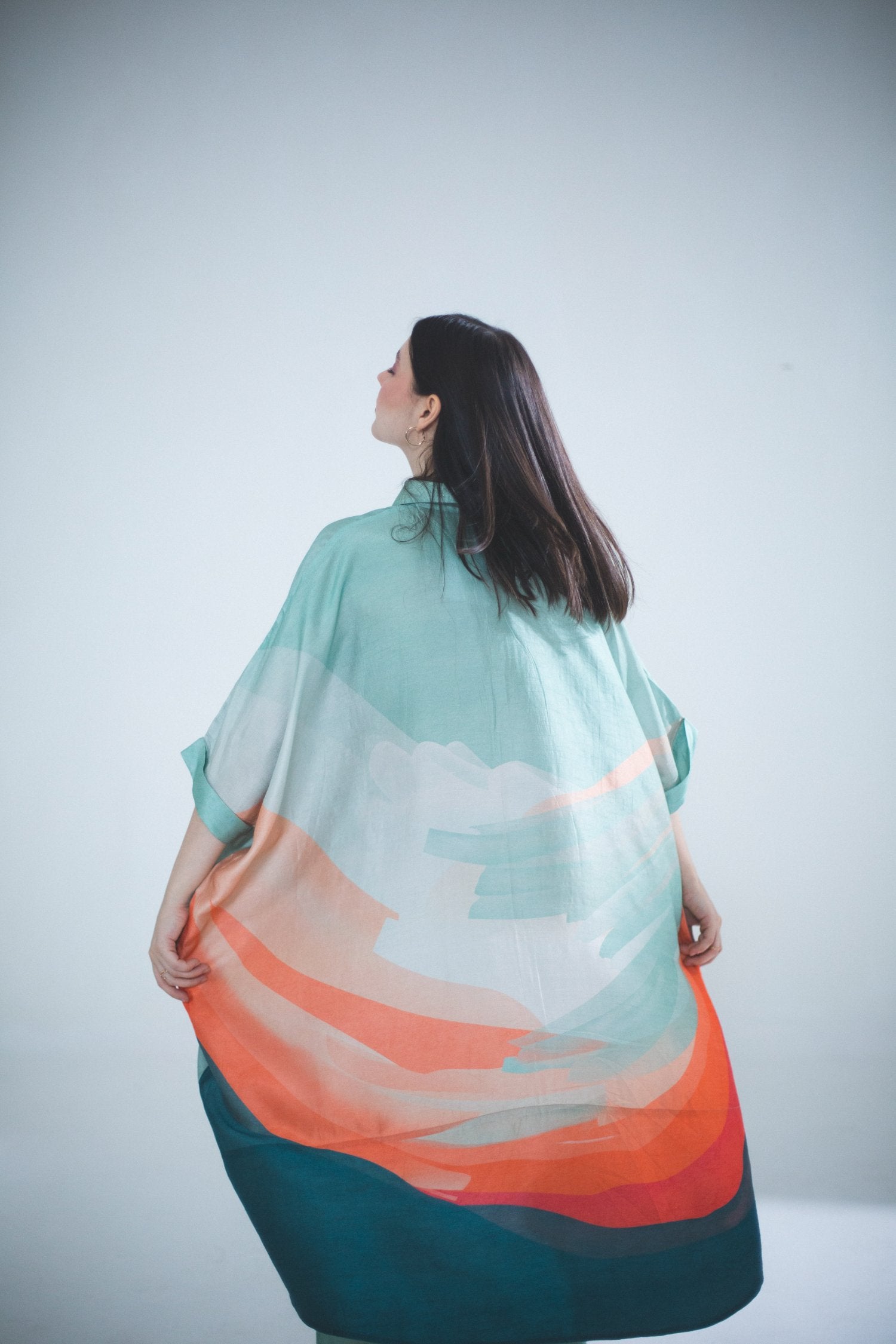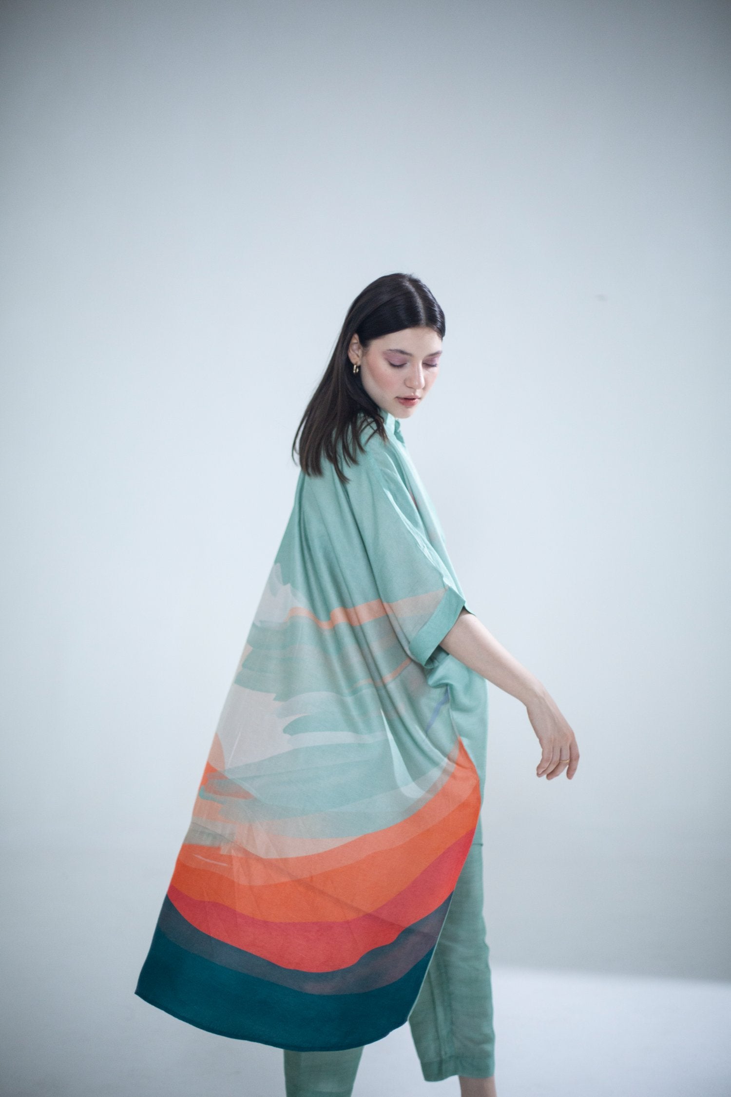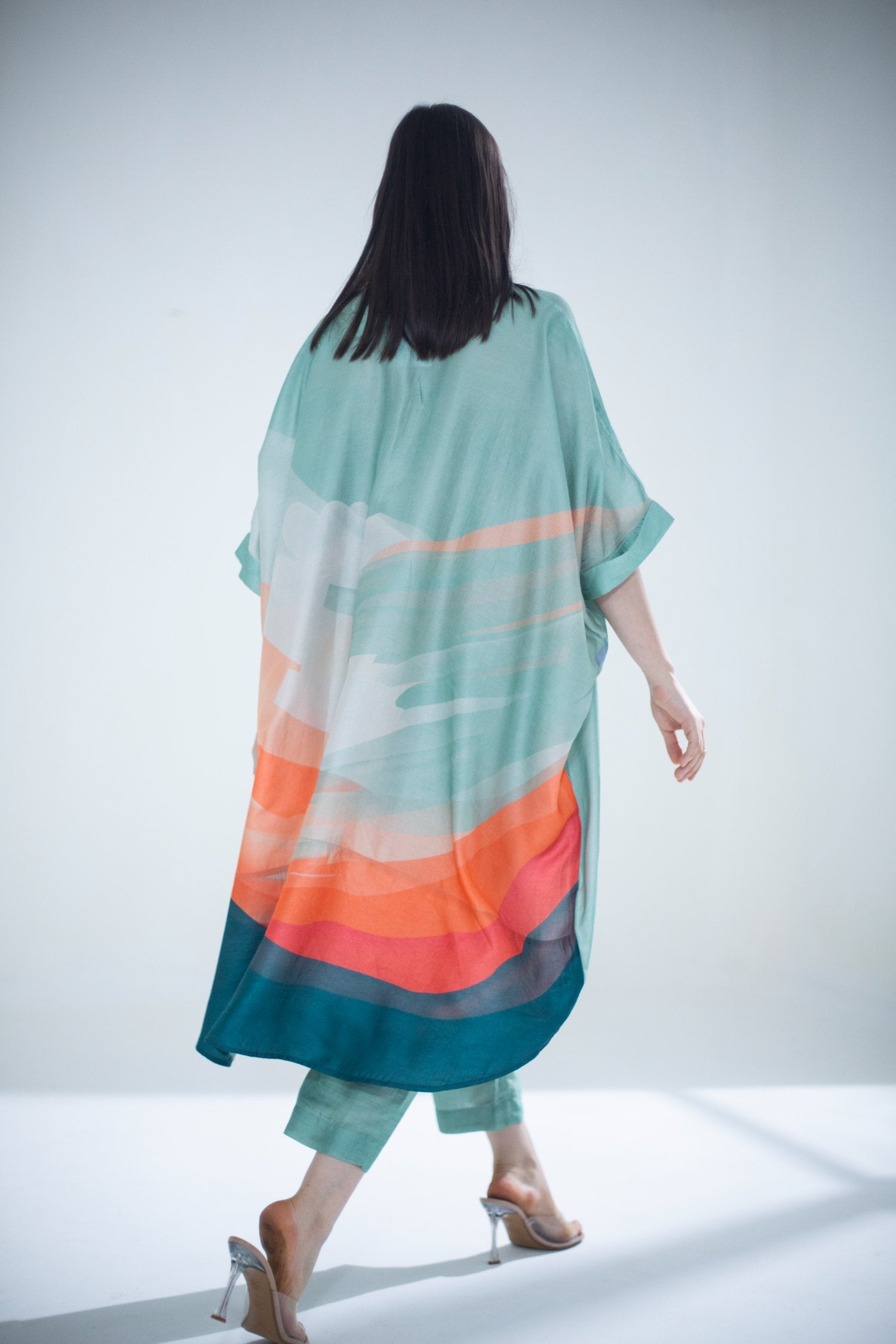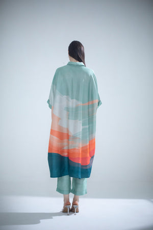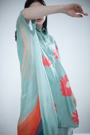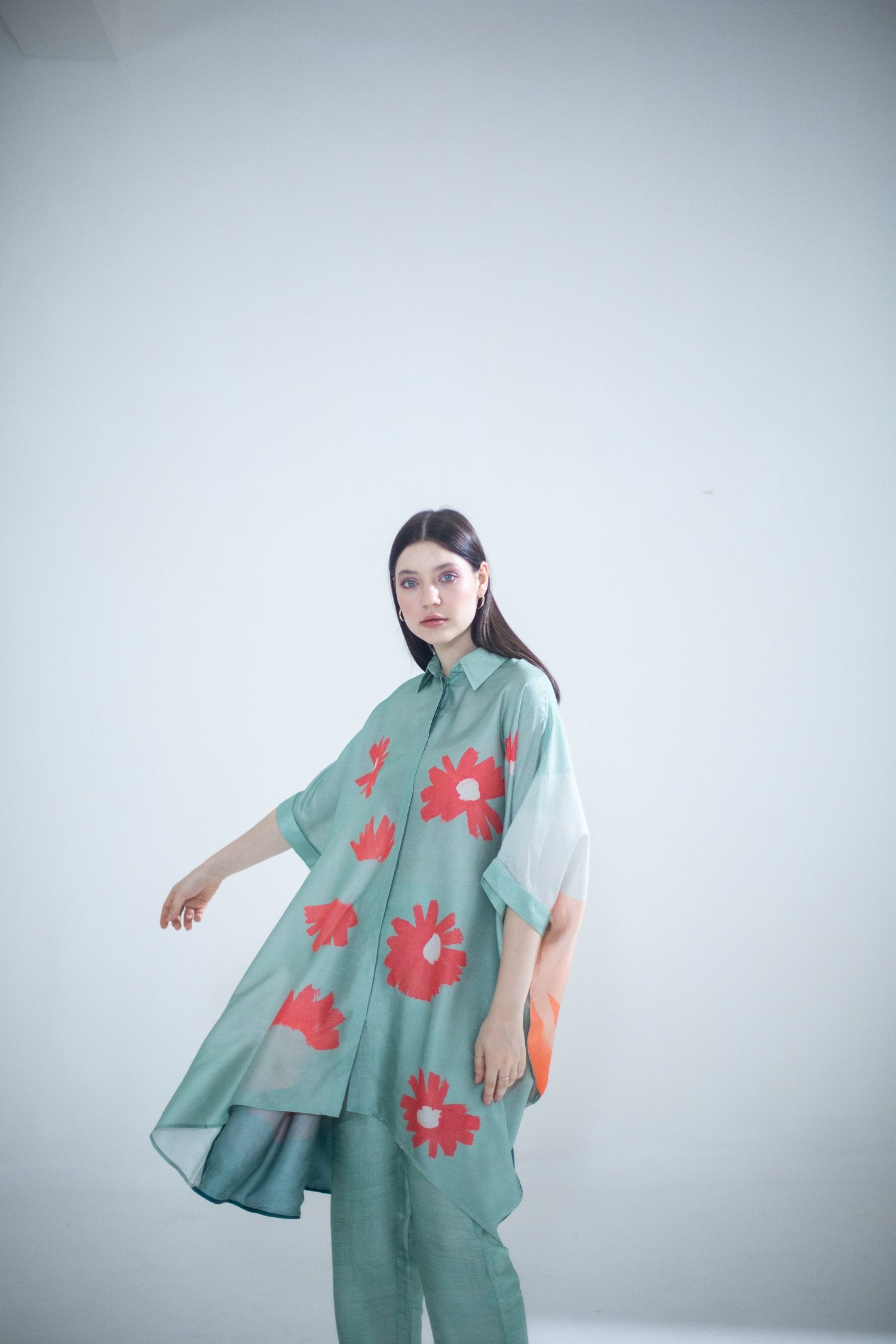 A two piece dupion silk set comprised of abstract geometric and floral print in playful color compositions and parallel pants with fusion textiles.