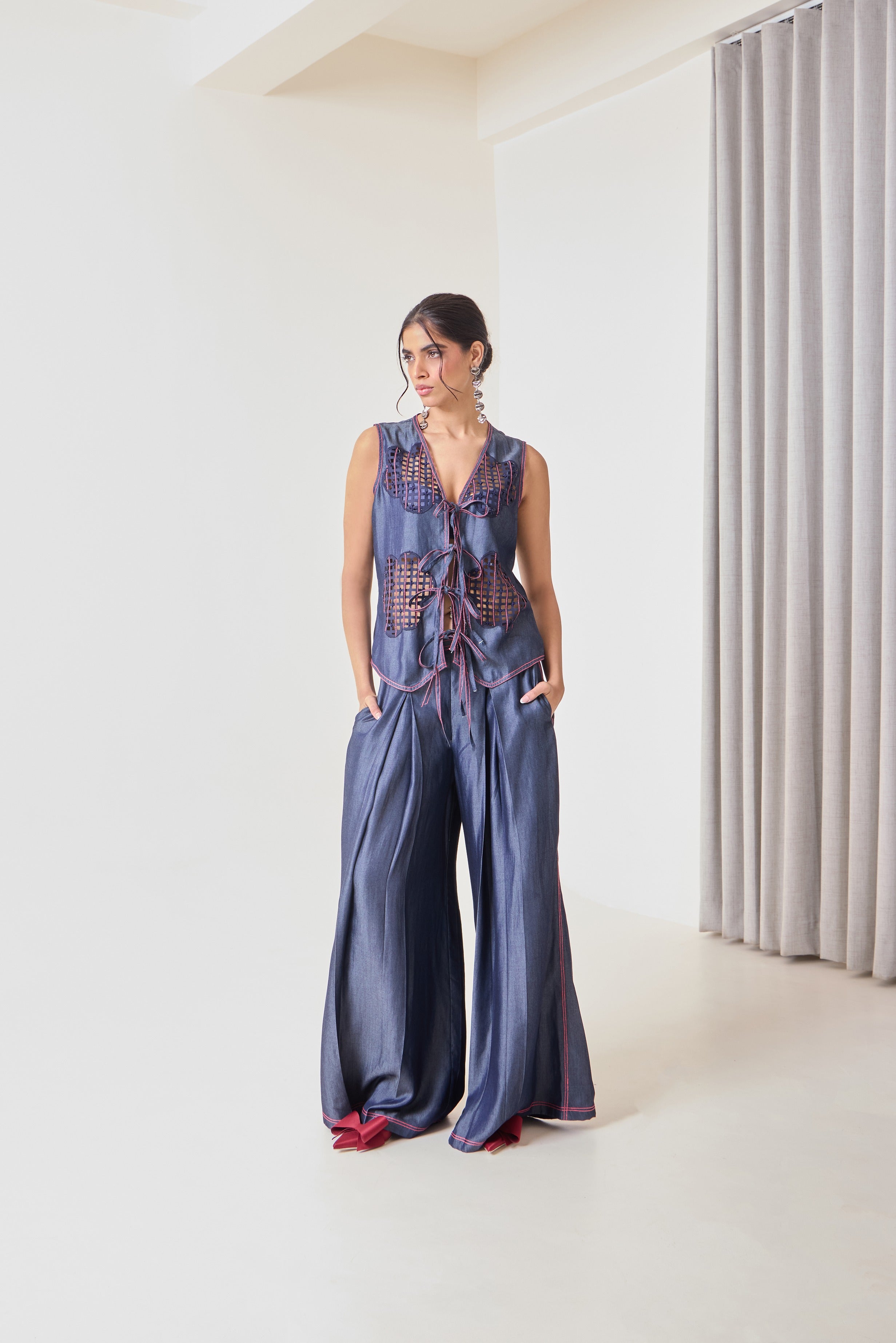 Flared denim pants in 100% Tencel for a soft, breathable feel. Designed with front pleats, side pockets, and a comfortable back elastic. Clean, versatile, and easy to style — they pair perfectly with the matching vest or can be worn as a standalone everyday or going-out piece.