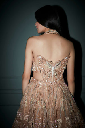Desert dust lehenga set with floral patch embroidery embellished with cutdana and sequins. The intricate fancy work graces the set, creating a mesmerizing play of textures. The blouse is a true statement piece, featuring a butterfly patch at the back.