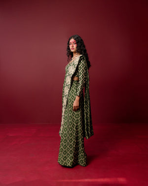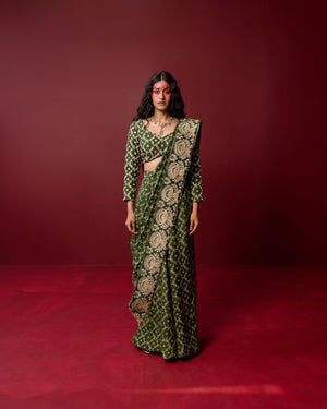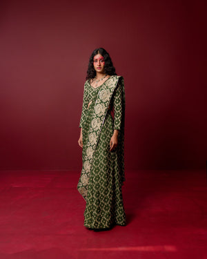Deveshi Saree defines supreme grace, beauty, and feminism. Durga means "impassable", "invincible, unassailable". It is adorned with intricate embellishments, such as delicate embroidery, sequins, and bead work that adds a touch of glamour without compromising on elegance.