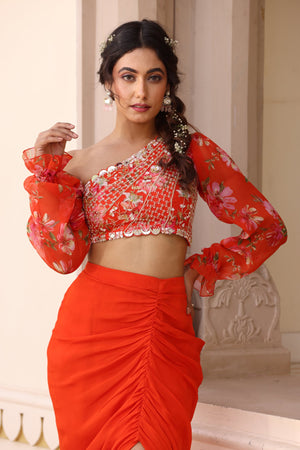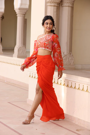 Georgette crepevGeathered Drape skirt with slit. Paired with One shoulder embroidered blouse, Bishop sleeves