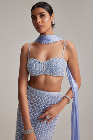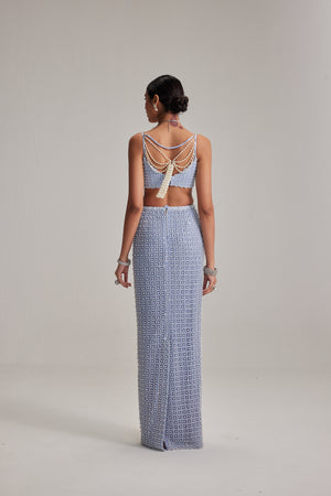 Dew Blue Pencil Skirt paired with a heavily embroidered blouse and Satin Stole With Cascading Pearl tassels.