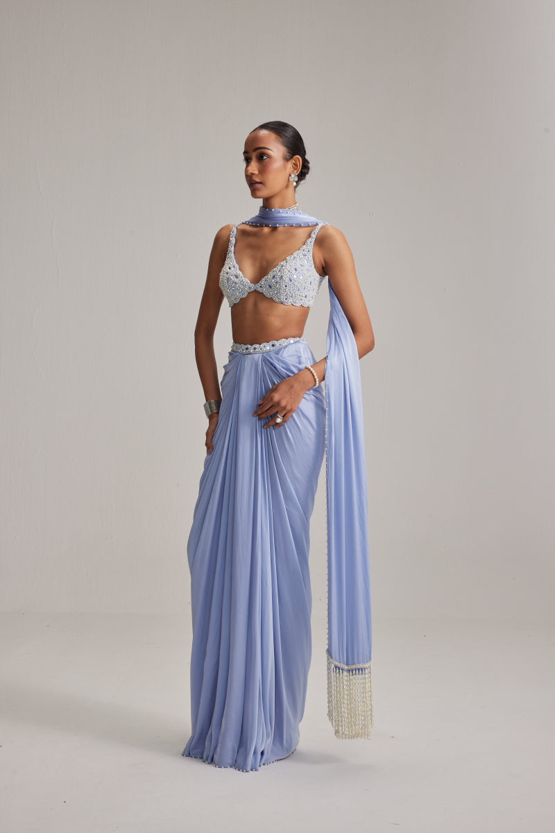 Dew blue Satin draped skirt set paired with a heavily mirror and pearl embroidered blouse and a satin stole.