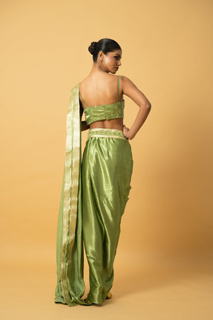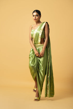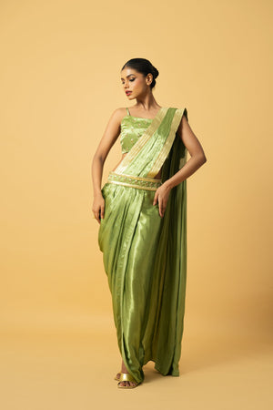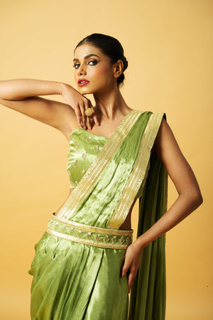 Bright Mint Green Modal Satin Dhoti Saree With Hand Embroidery On Blouse & Golden Lace On Saree Pallu . Pallu Is Pre Pleated And Saree Pre Draped .