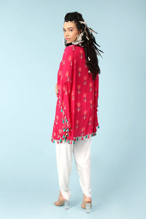 Reflect your unique style with the short kaftan kurta. Made from fine silk crepe and adorned with exquisite hand embroidered mirror and gold thread work, this kurta is a luxurious addition to any wardrobe. The edging of tassels and shells lends the final touch of sophistication, making it perfect for any special occasion.