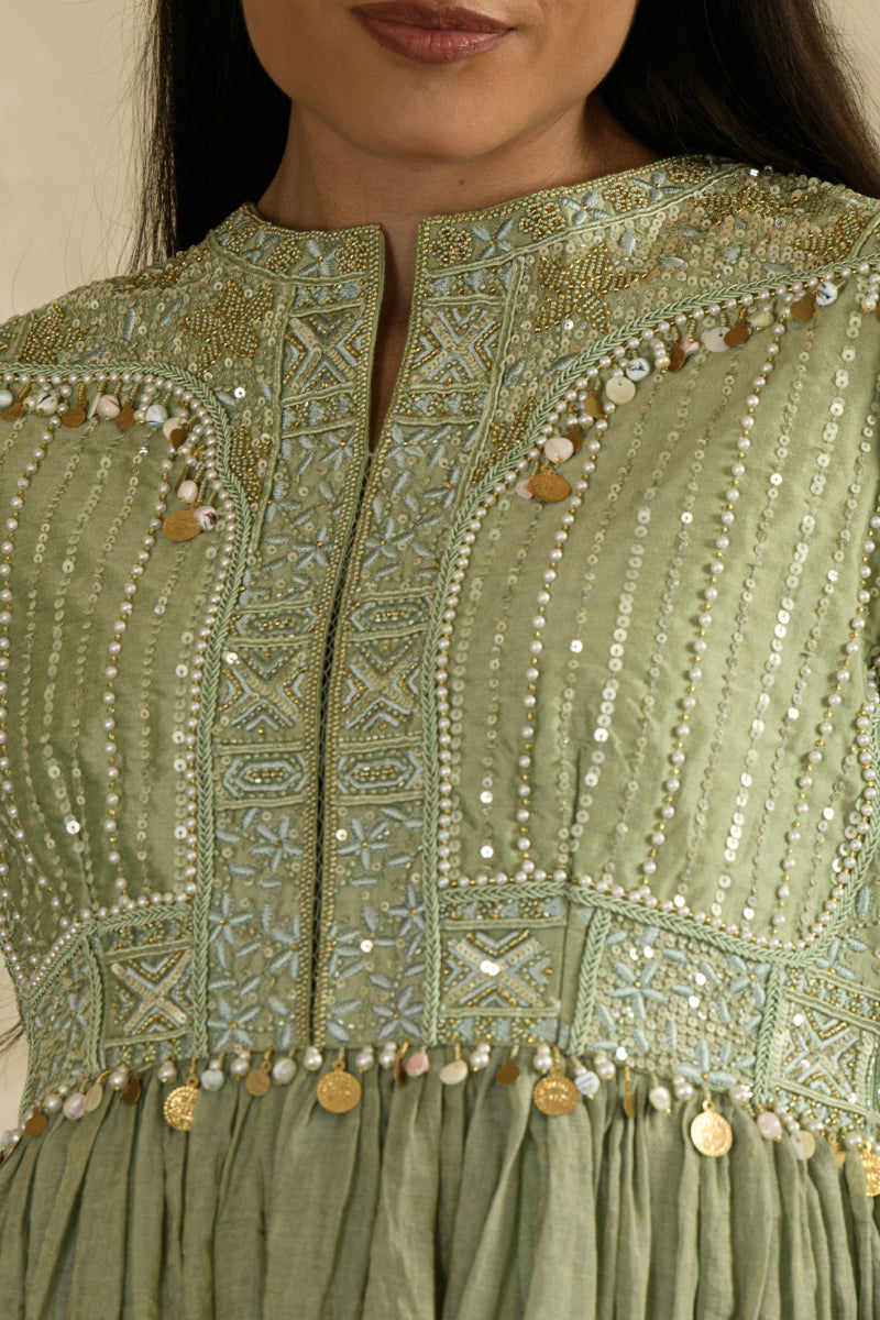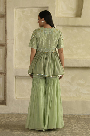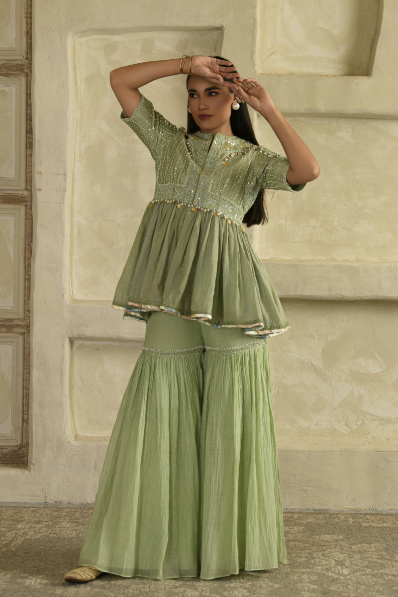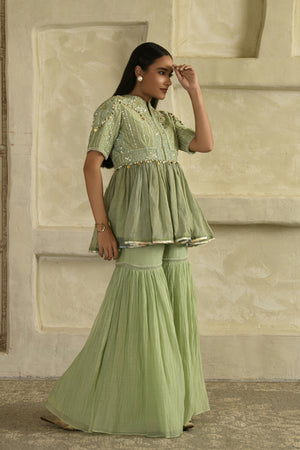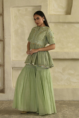 Featuring a pista green short peplum with an embellished yoke in mul chanderi tissue with coin & shell tassels and multicolor piping. It is paired with garara with hand embroidred details.