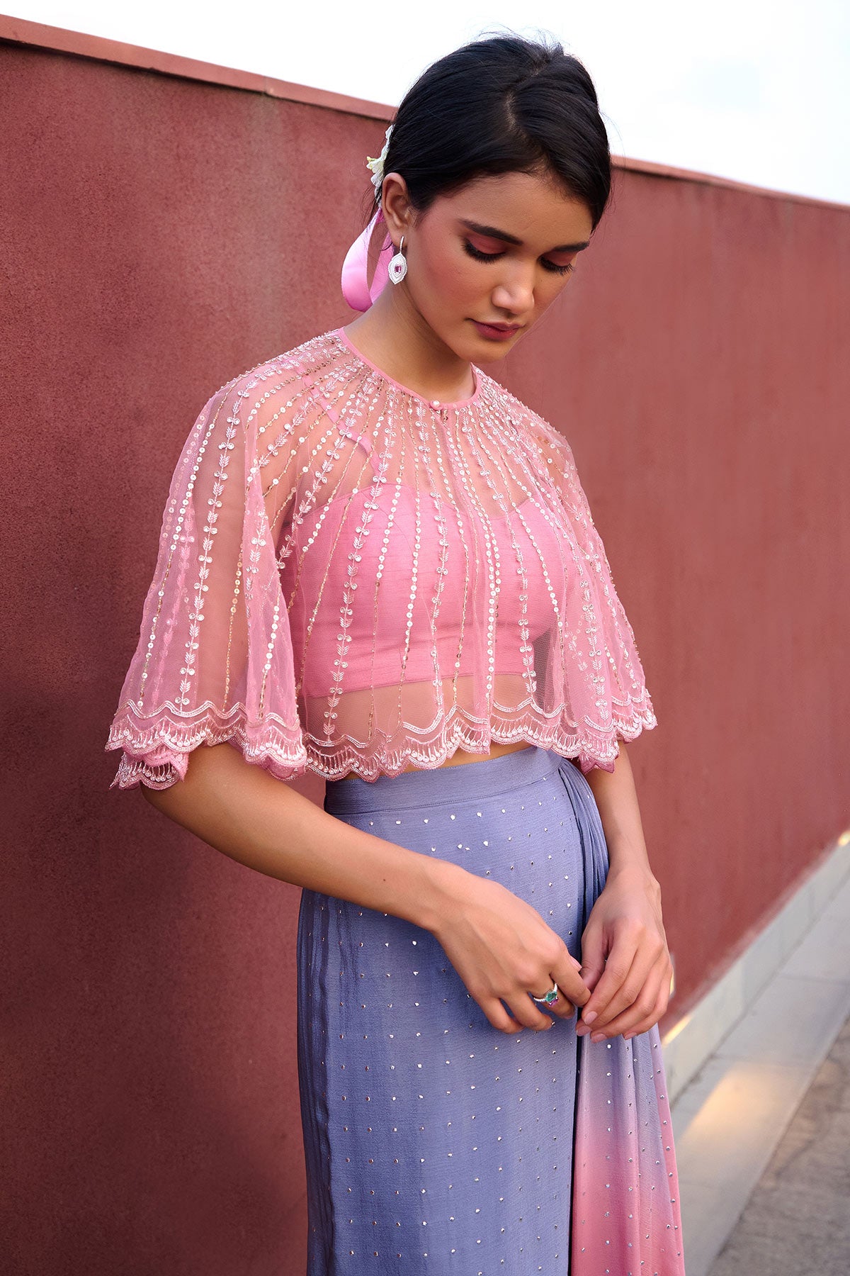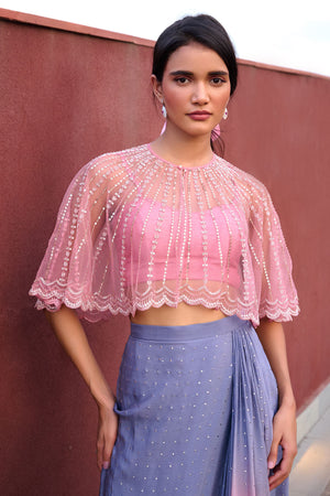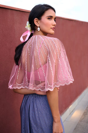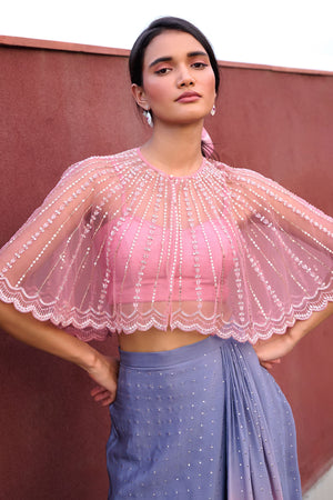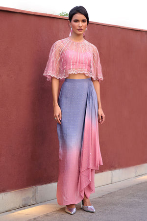 Grey to Mauve Pink Ombre drape skirt paired with mauve pink bustier and glassbeads and sequence detailed cape