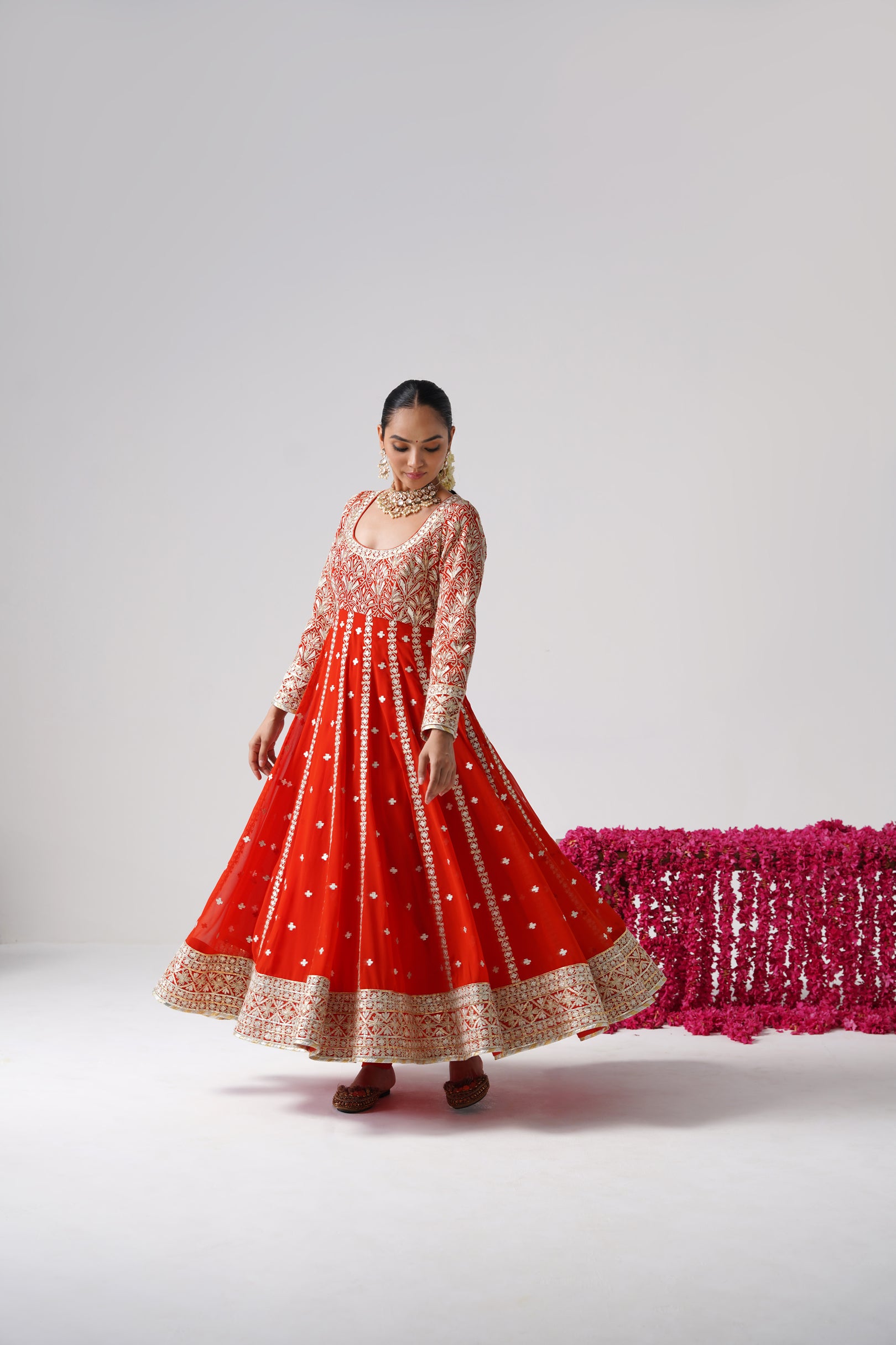 The Dilruba Kalidaar Set is a graceful celebration of traditional charm and modern allure. Crafted in flowy georgette, the kalidaar features intricate silver and gold gota detailing that adds a subtle festive sheen. It is paired with a comfortable lycra net churidar and a delicate silk organza dupatta, completing the look with effortless sophistication — perfect for weddings and special occasions.