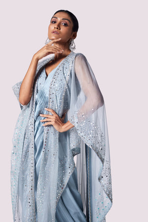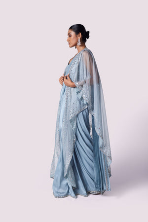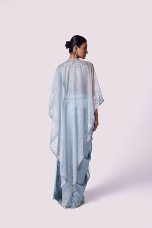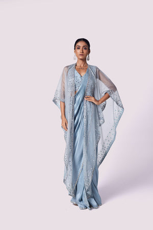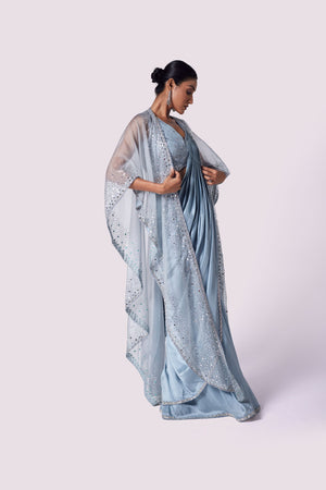 Doctor blue russian silk pre-stitched saree with narrow embellished edges. Comes with an entirely embellished sleeveless blouse, belt and a see-through net cape jacket. Embellishments include mirror, sequins, cutdana and Swarovski crystals.