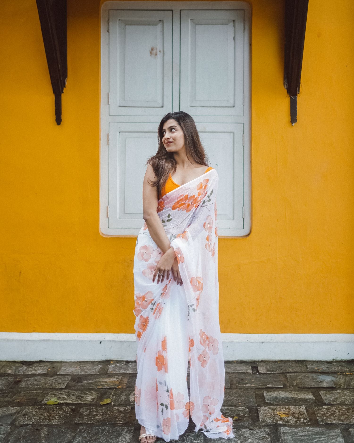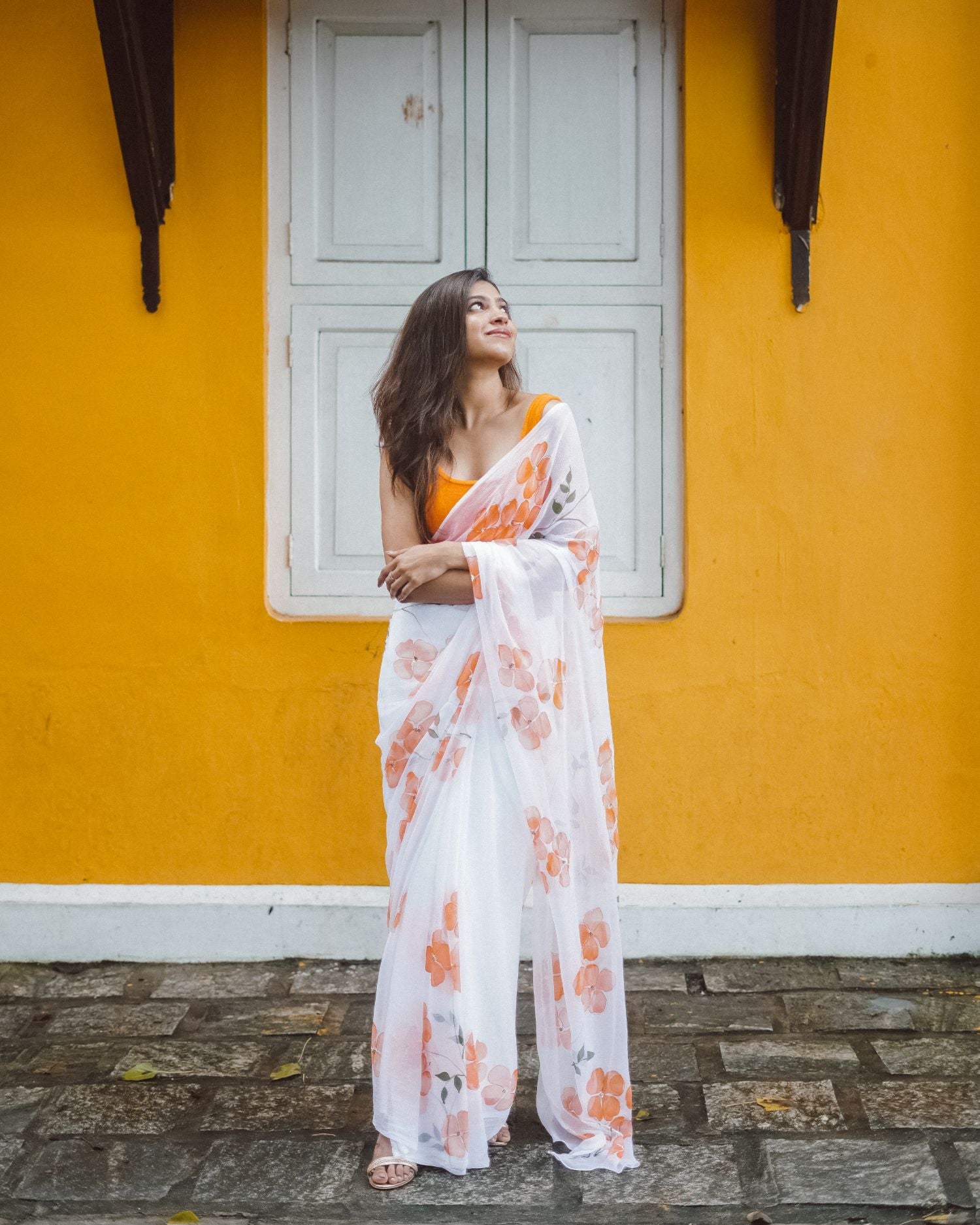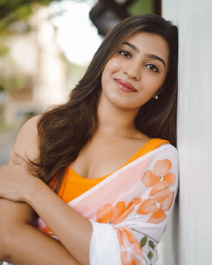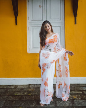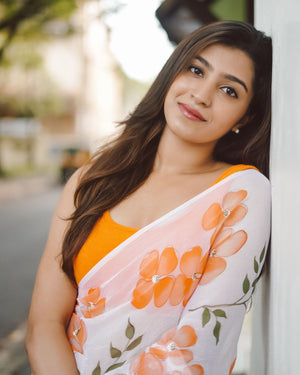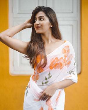 White Base Chiffon Saree Hand-Painted With Orange Dogwood Flowers
