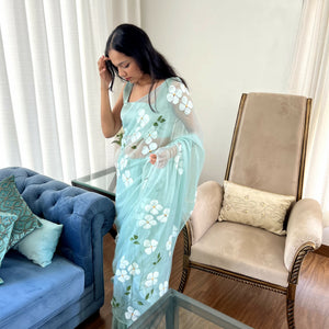 Teal Base Chiffon Saree Hand-Painted With White Dogwood Flowers